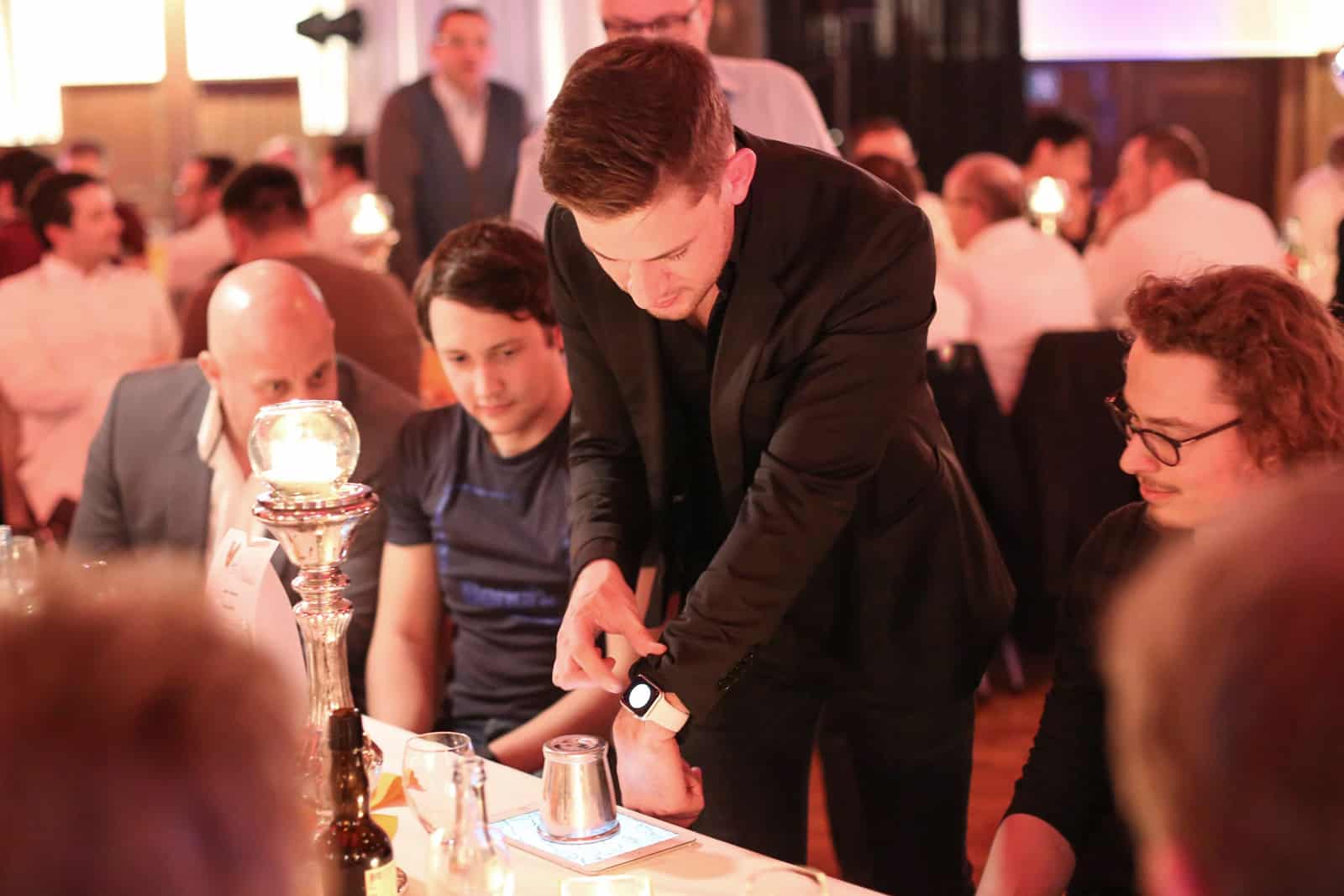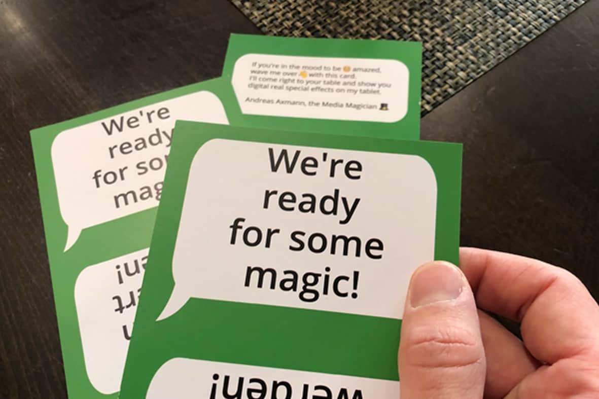 Andreas Axmann überrascht mit seinem Walking Act seine Zuschauer hautnah und interaktiv direkt am Tisch. Mit einem kleinen Tablet und einer Smartwatch zeigt der „Media-Magier“ ein digitales Hütchenspiel, eine scheinbar echt funktionierende Steckdose oder wie man Löffel erst im Display und dann real verknoten kann. Diese Variante der Show funktioniert dezentral ohne Bühne in allen Raumsituationen und fördert die Kommunikation unter den Gästen. Digital-reale Spezialeffekte hautnah!